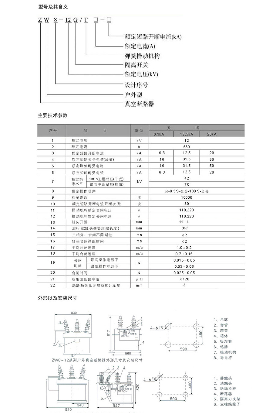 ZW8-12系列真空斷路器為額定電壓12KV,三相交流50Hz的高壓戶外開(kāi)關(guān)設(shè)備,主要用來(lái)開(kāi)斷關(guān)合農(nóng)網(wǎng),城網(wǎng)和小型電力系統(tǒng)的負(fù)荷電流,過(guò)載電流短路電流,該產(chǎn)品總體結(jié)構(gòu)為三相共箱式,三相真空滅弧室置于金屬箱內(nèi),利用SMC 絕緣材料相間絕緣及對(duì)地絕緣,性能可靠,絕強(qiáng)度高。 ZW8-12是由ZW8-12斷路器與隔離刀組合而成的稱為組合斷路器,可作為分段開(kāi)關(guān)使用。本系列產(chǎn)品的操作機(jī)構(gòu)CT23型彈簧儲(chǔ)能操作機(jī)構(gòu),分為電動(dòng)和手動(dòng)而成。