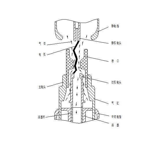 3.1斷路器采用六氟化硫(SF6)氣體作為滅弧介質(zhì),六氟化硫氣體不但有良好的滅弧性能,而且電氣絕緣性能非常好,氣體在開斷時被壓氣筒壓縮后噴向電弧并將電弧熄滅,開斷的簡單原理如圖1。該斷路器具有結(jié)構(gòu)簡單、開斷性能良好,并且操作平衡等許多優(yōu)點。它還是一種理想的切合電容器組及電抗器組的開關(guān)。